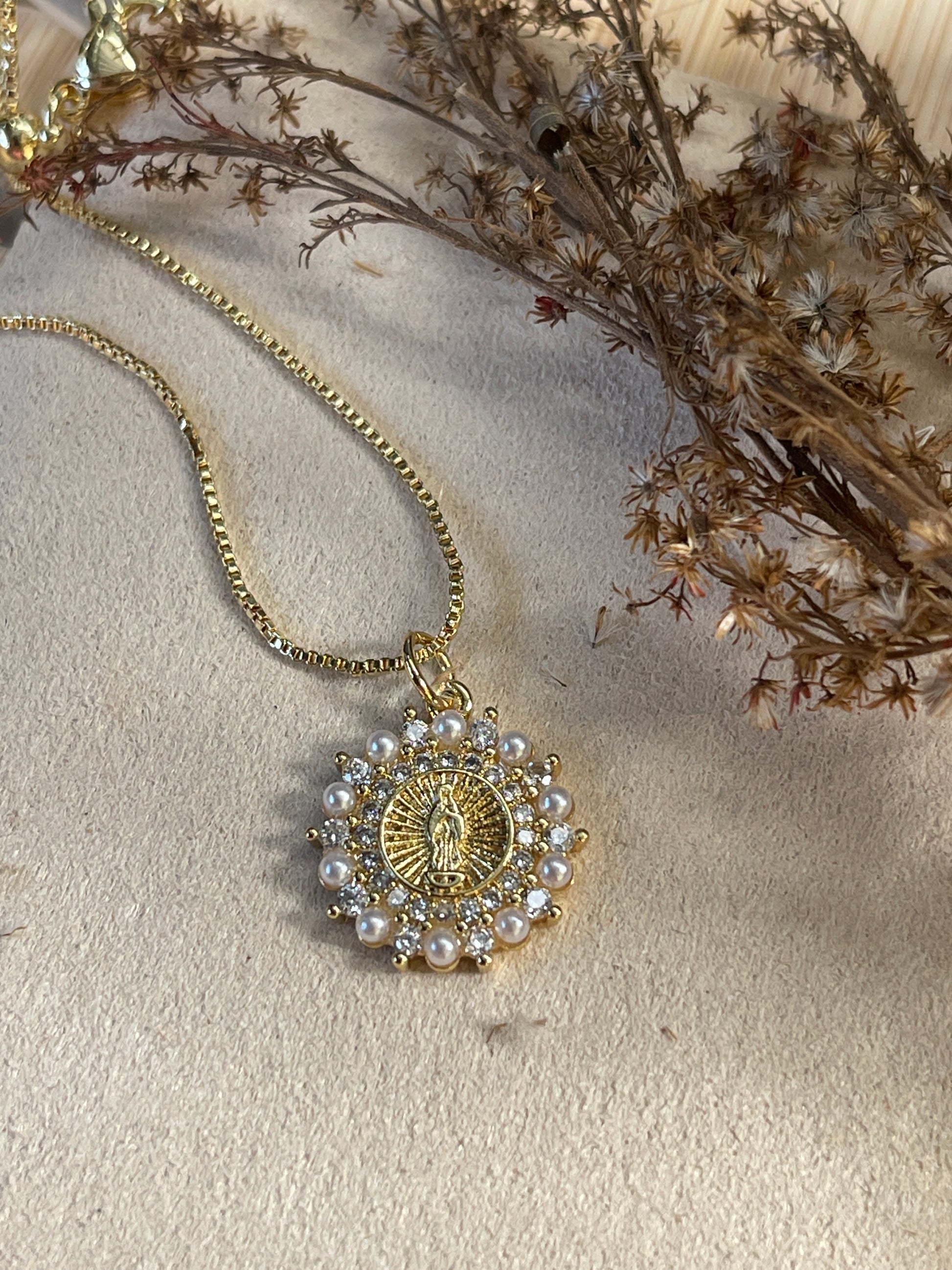 Cadena con dije de virgen y perlitas , oro laminado