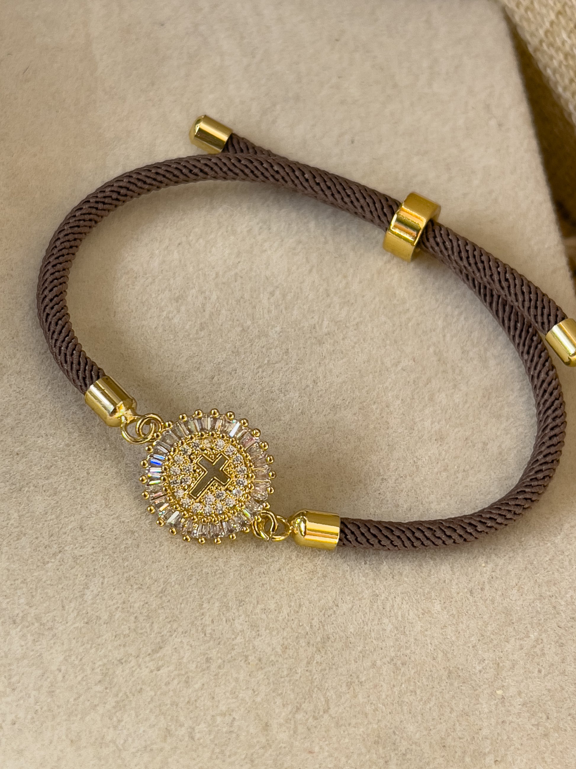 Pulsera de cordón ajustable , dije de oro laminado en cruz